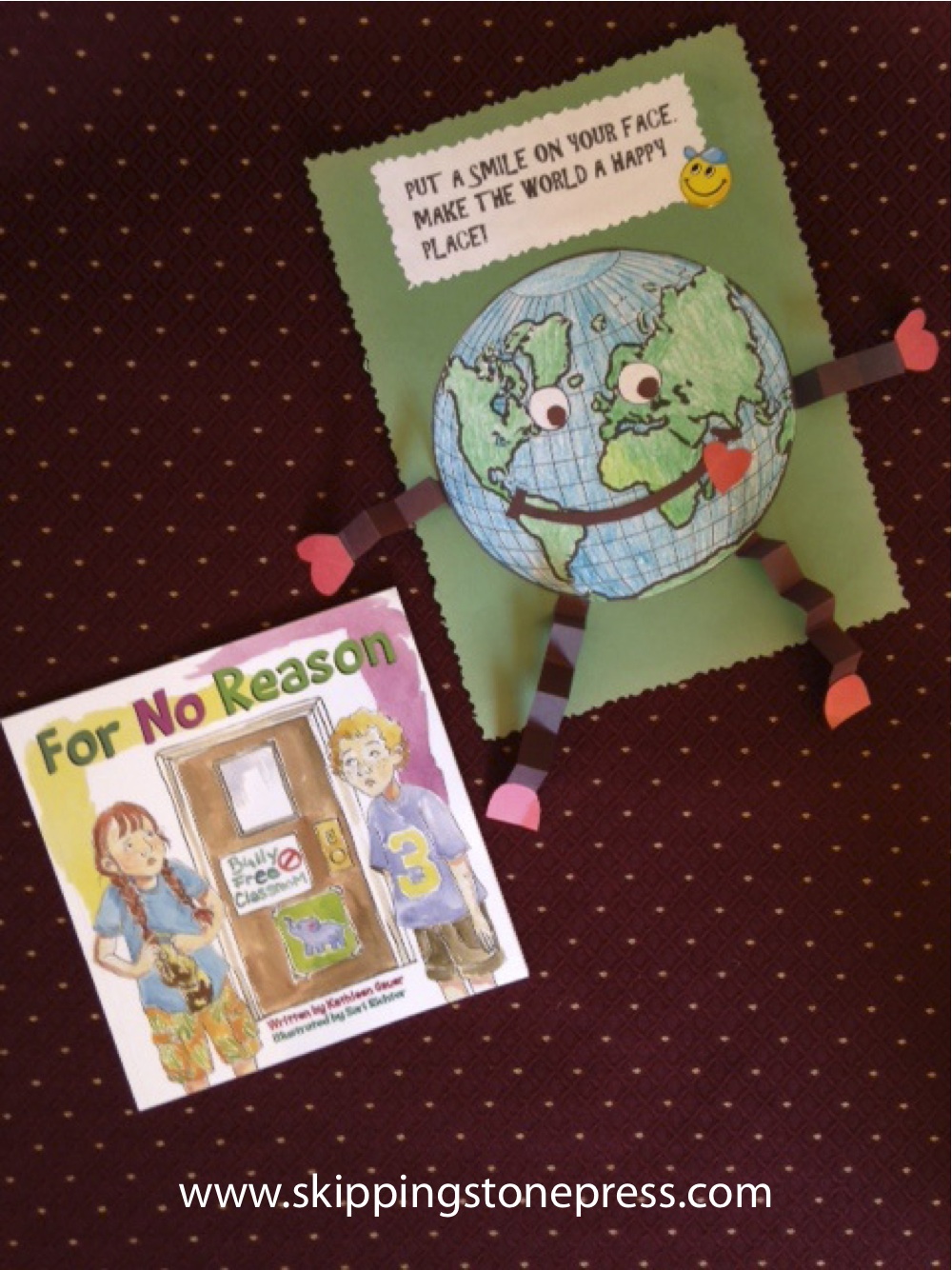 4. Glue the world globe onto the centre of the green construction paper, tucking and fastening the arms and legs just under the edges of the world.
